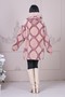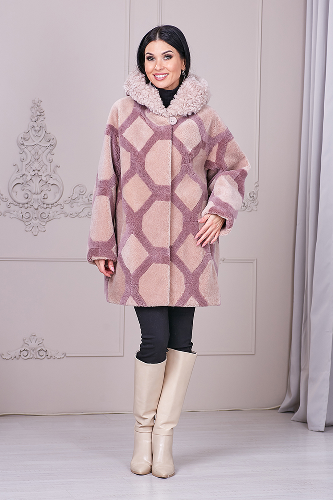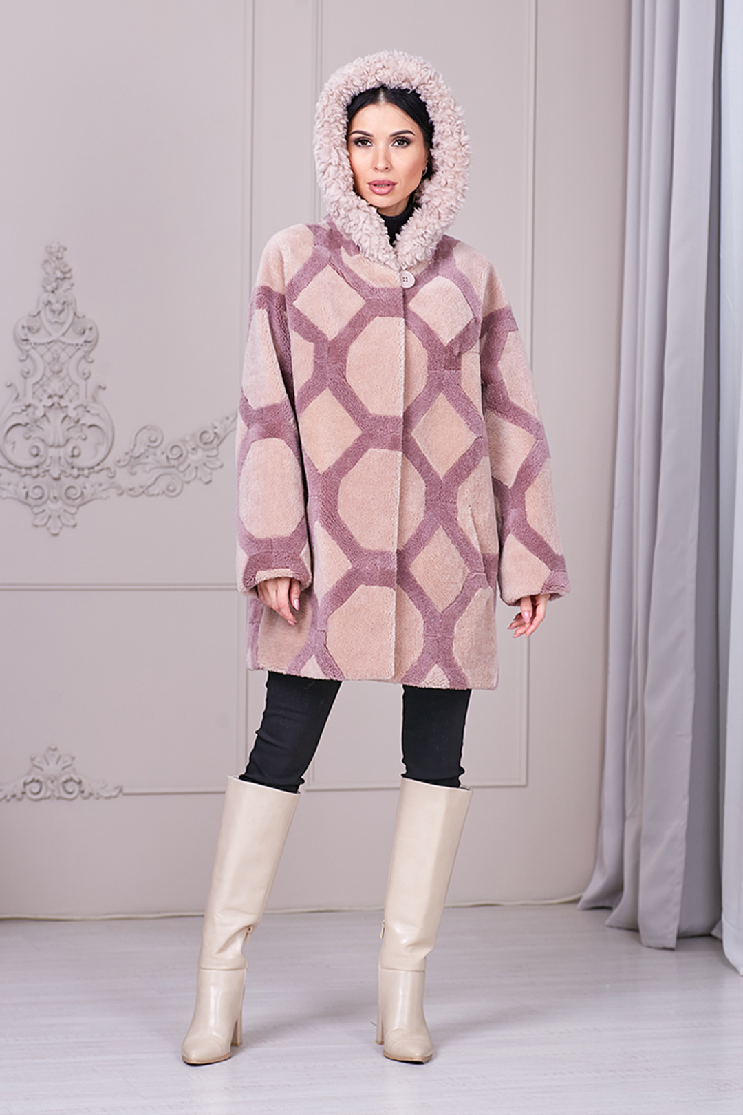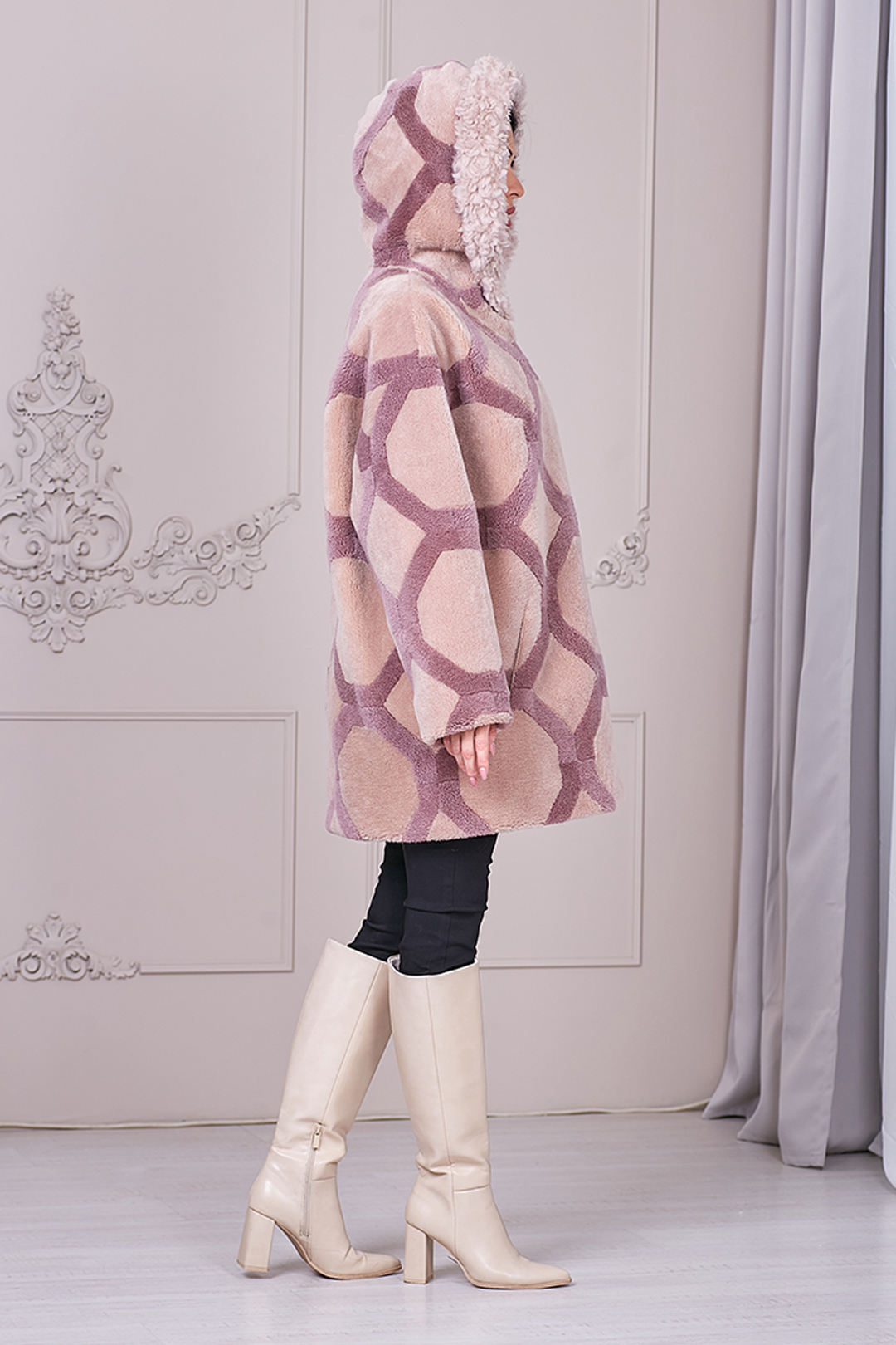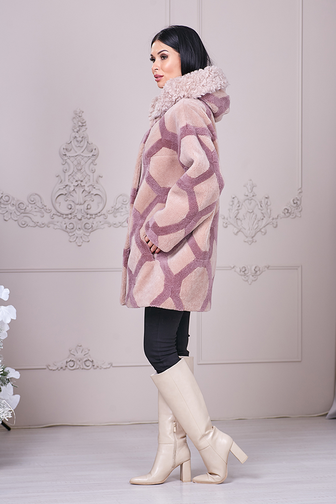 Куртка женская из овечьей шерсти ЭМ-128 (Сливки+бежево-розовый+темно-розовый) с капюшоном
